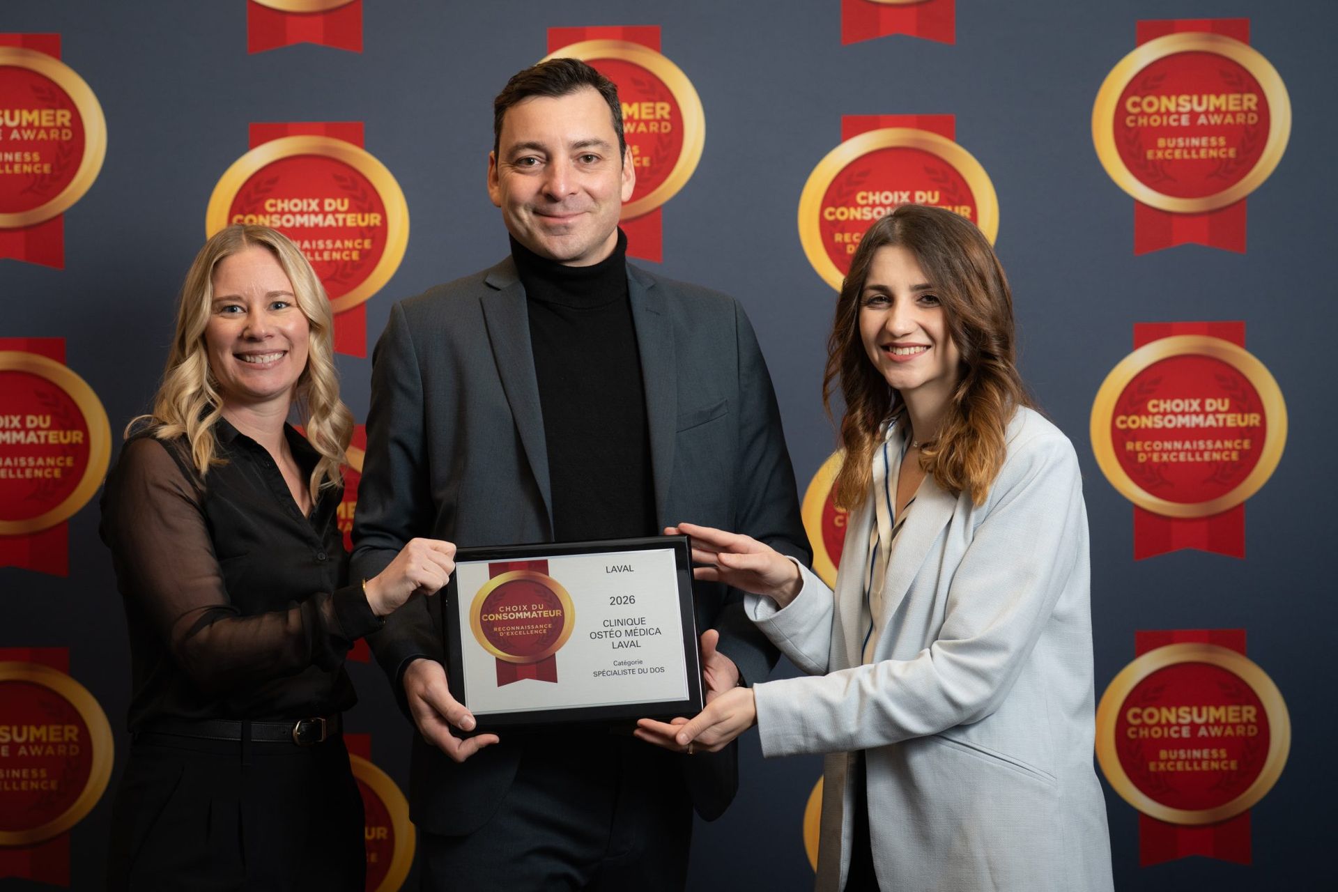 Ostéo Médica est une clinique d’ostéopathie et de massothérapie à Laval reconnue pour la qualité et la rigueur de ses soins. Lauréate du Prix d’Excellence – Choix du Consommateur Laval 2026, notre équipe accompagne adultes, familles, sportifs et travailleurs dans la prise en charge des douleurs musculo-squelettiques, tensions, stress et troubles fonctionnels. Nous desservons Laval, la Rive-Nord et Montréal avec une approche professionnelle, personnalisée et fondée sur une évaluation globale du corps.