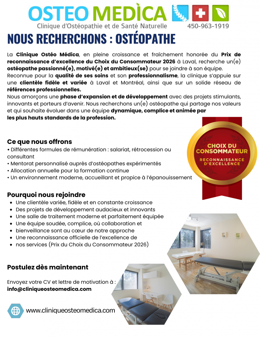 La Clinique Ostéo Médica, est bien reconnue dans le secteur de l’ostéopathie, ainsi que par le public à Laval depuis 12 ans.